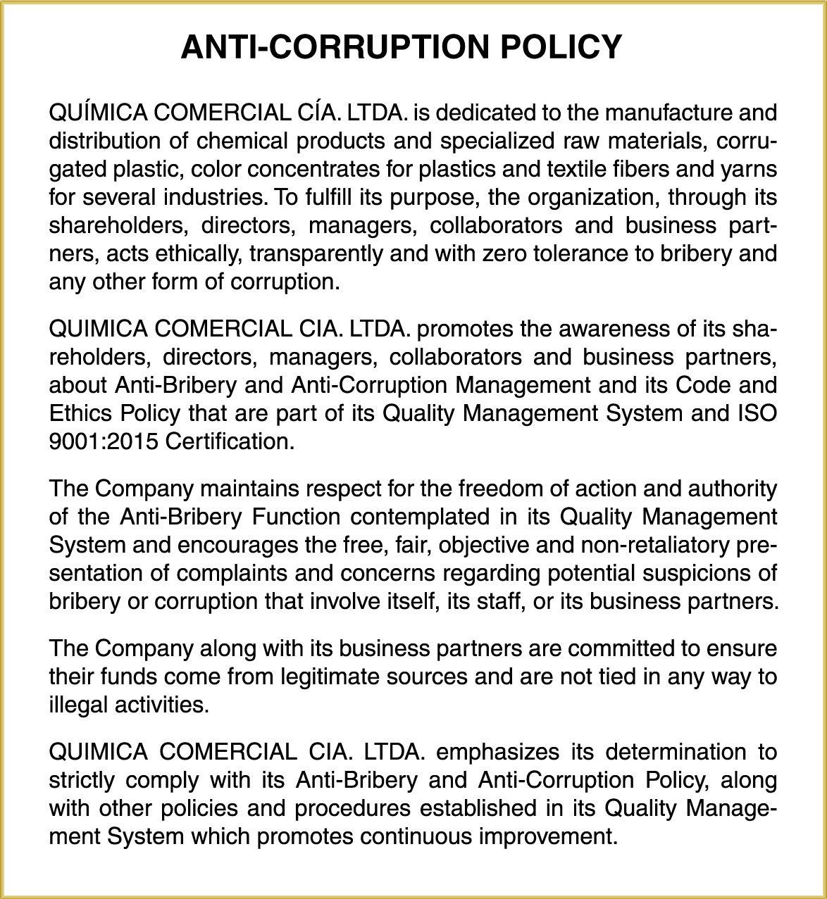 In 2004, QUIMICA COMERCIAL obtained its ISO 9001:2000 certification and currently has an ISO 9000:2015 certification awarded by SGS.
