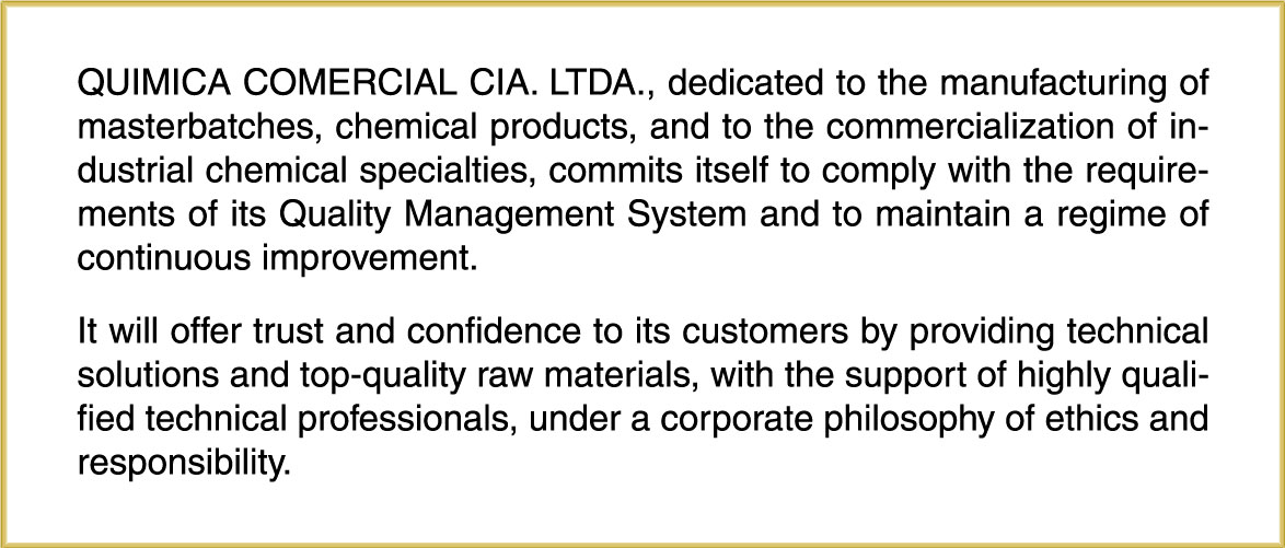 Since its birth in 1980, QUIMICA COMERCIAL has significantly contributed to the development and growth of the Ecuadorian industry by offering specialty chemicals of the highest quality.